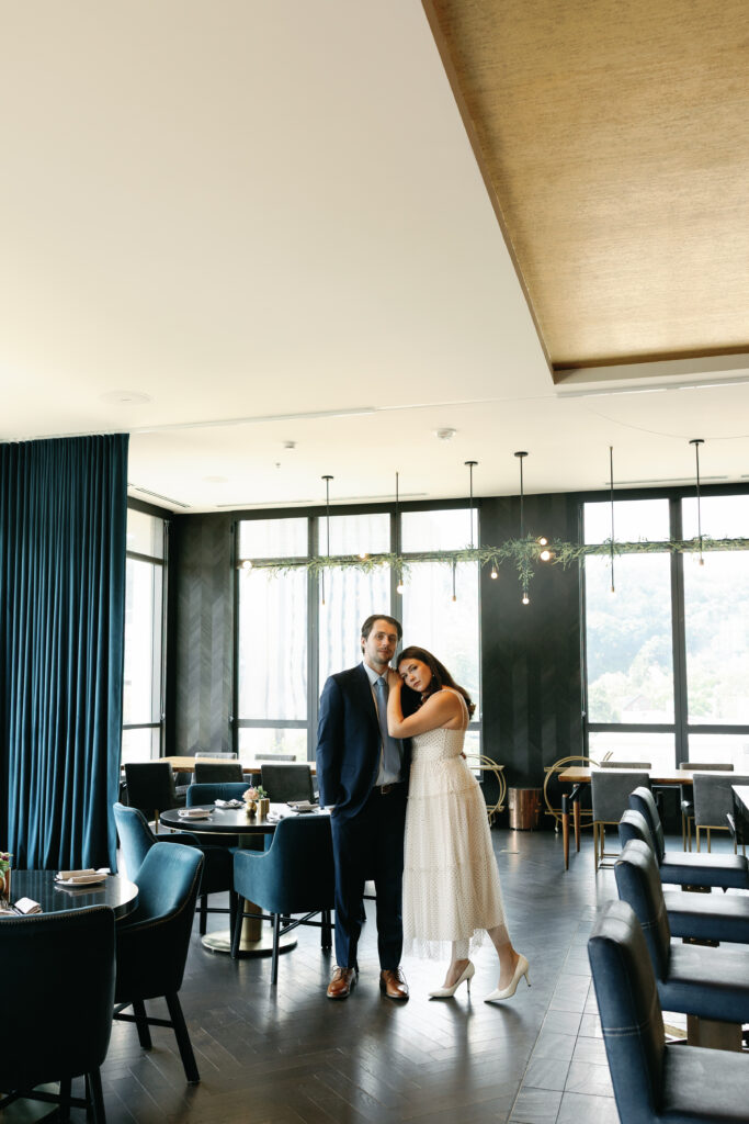 The Industralist Hotel blends historic architecture with contemporary design and offers a variety of beautiful interior spaces for engagement sessions. The first-floor Rebel Room bar and restaurant features warm lighting, a refined atmosphere, and stylish details that photograph beautifully, while the second-floor check-in area sometimes features a pop-up bar or seasonal lounge that adds another unique layer to your gallery. The striking black-and-white checkered floor and sleek communal spaces make this location ideal for couples who want a relaxed yet editorial look with a bit of personality. It’s especially well-suited for cooler seasons or as a polished indoor plan-B option.